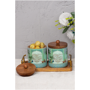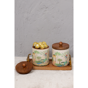 The Dancing in the Dusk Storage Jars (Set of 2) are designed for those who find beauty in quiet, reflective moments. Inspired by twilight tones and delicate floral motifs, these jars embody calmness and tradition. Crafted from sustainable mango wood and paired with a matching tray and gold handles, the set exudes understated luxury. Perfect for those who appreciate mindful living, this duo is ideal for gifting or enhancing a cozy corner with a touch of artistry and warmth.