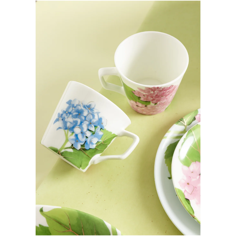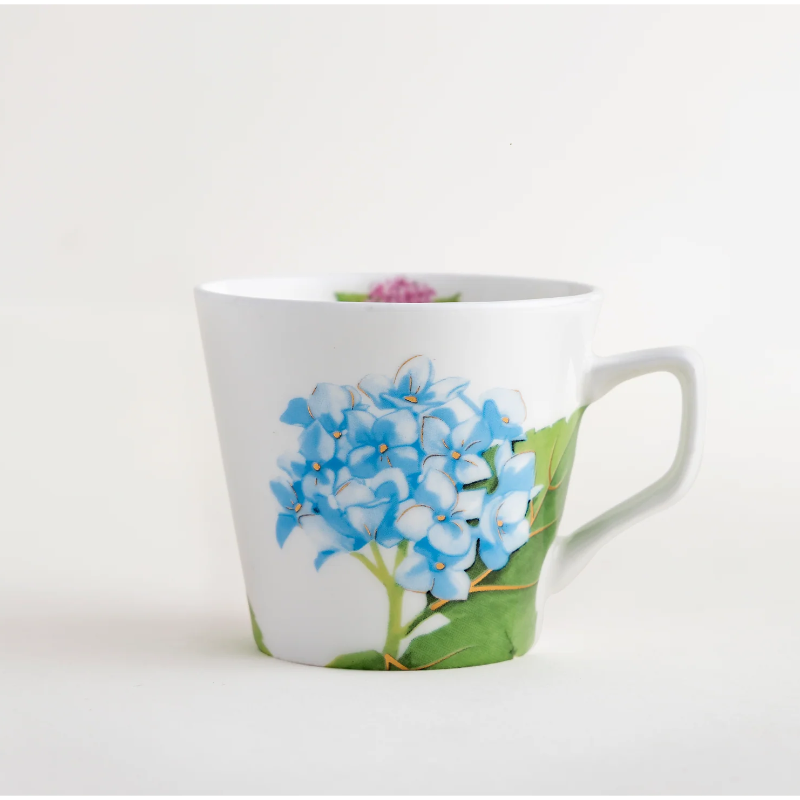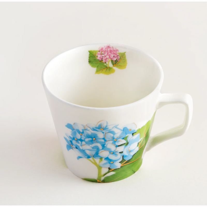 Classic fine china mug featuring vibrant pink and blue hydrangeas, delicately adorned with 24-carat gold accents. A graceful nod to spring, perfect for elevating your everyday tea ritual. Products are not microwave safe/dishwasher safe. Wash gently with water using a non-abrasive scrub.