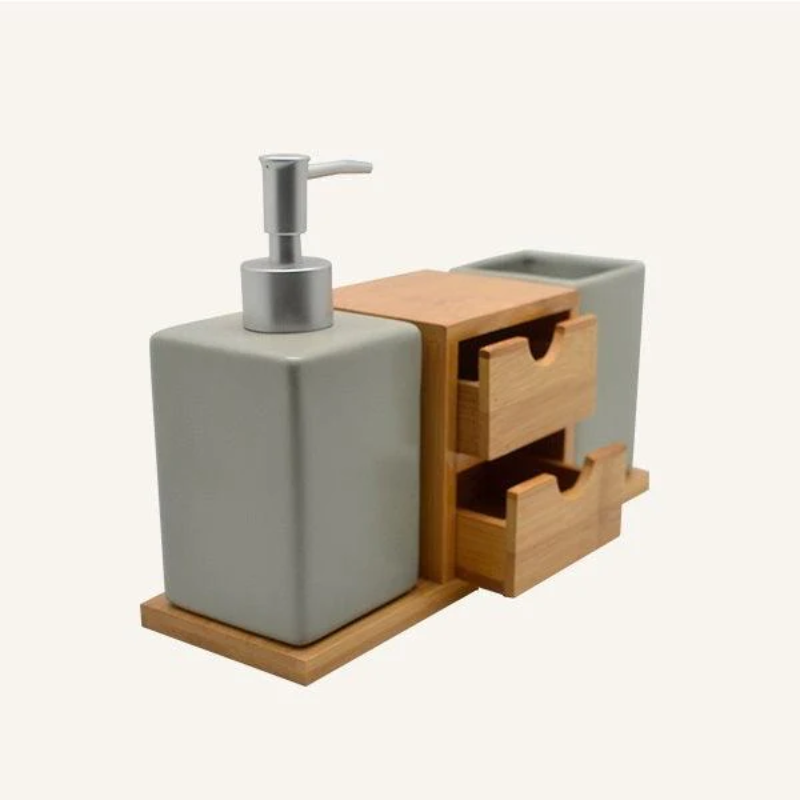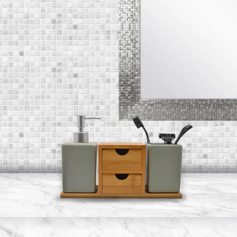 Truly Japanese in form, with straight lines and gentle curves, the three-piece fusion ceramic and bamboo bathroom accessory set is complete with a dispenser, a holder and two drawers. Hand-crafted in textured ceramic, this stone grey and natural bamboo set adds an organic aesthetic to the bathroom.3 Piece set includes: Liquid soap dispenser with matt stainless steel pump | toothbrush and shaving accessories holder | Natural Bamboo drawers to store make up and dental accessories. Hand-crafted stone grey ceramic | size and design just to fit perfectly in your bathroom ambience. Natural Bamboo stand with two drawers is first of its kind. The high quality bamboo is tested and water resistant.