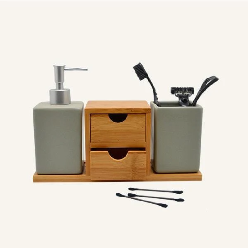 Ceramic Grey Bathroom Set With Bamboo Drawers