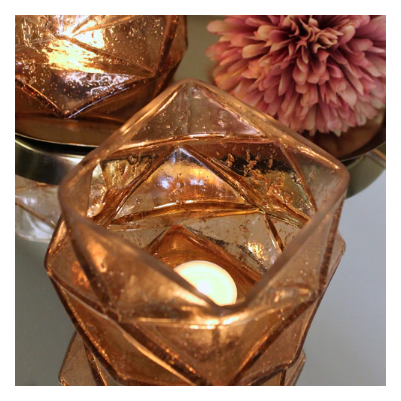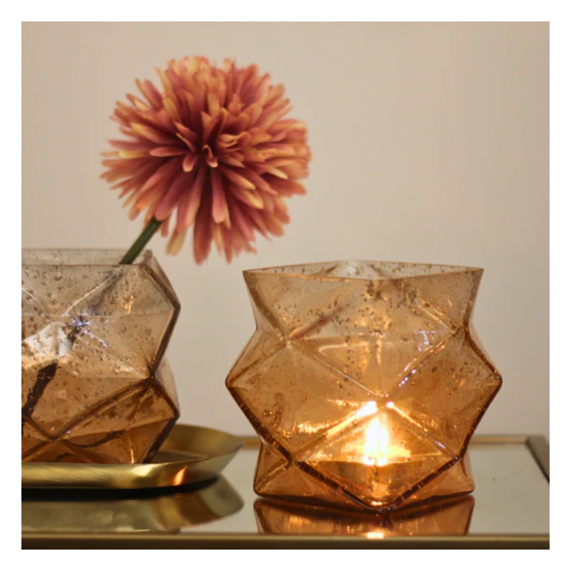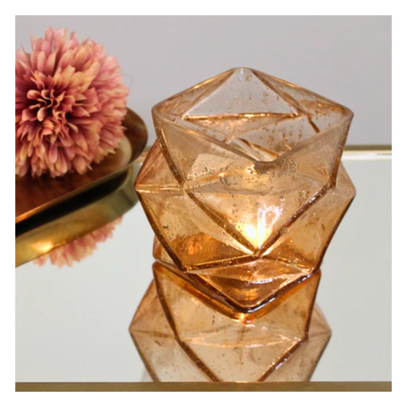 Add a touch of geometric elegance to your decor with this hexagonal votive/vase crafted from recycled glass. Its faceted surface reflects a warm glow when used as a candle holder, while doubling beautifully as a vase for fresh or dried blooms. Sustainable, versatile, and striking, this set of two is a must-have for mindful yet stylish living.