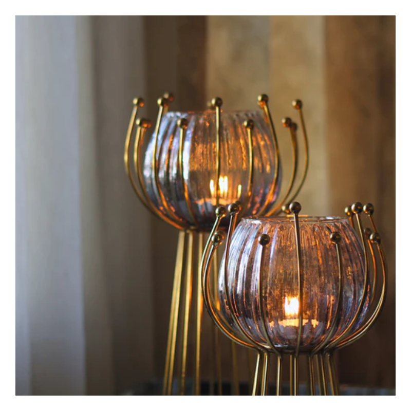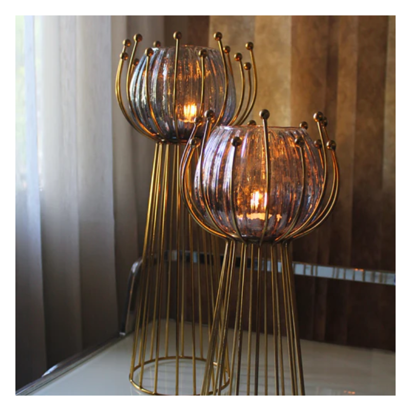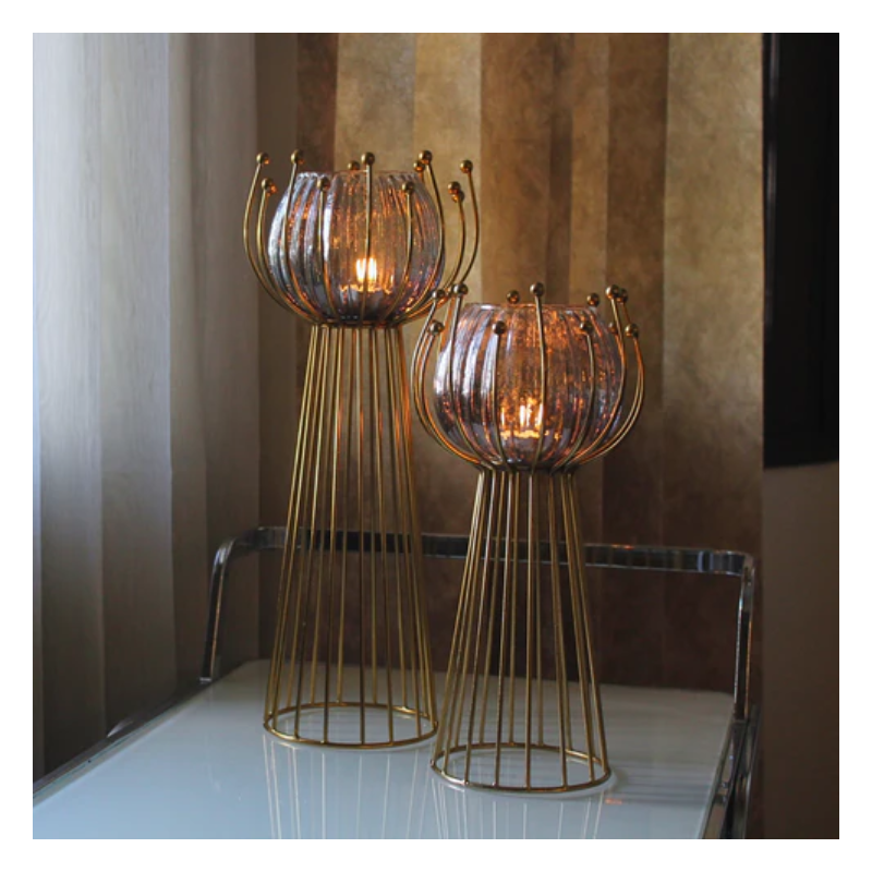 Grace your home with the elegance of the Lotus Candle Holders, a stunning fusion of modern metalwork and artisan glass craftsmanship. Designed with tall golden stems that bloom into lotus-inspired crowns, these holders cradle detachable ribbed glass votives that diffuse a warm, enchanting glow. Whether styled in your living room, dining space, or as an entryway statement, their sculptural presence adds grandeur and serenity. Sold as a set of two in varying heights, they bring depth and harmony to any decor arrangement. Wipe metal with a dry cloth; hand-wash glass votives separately. Avoid harsh abrasives.