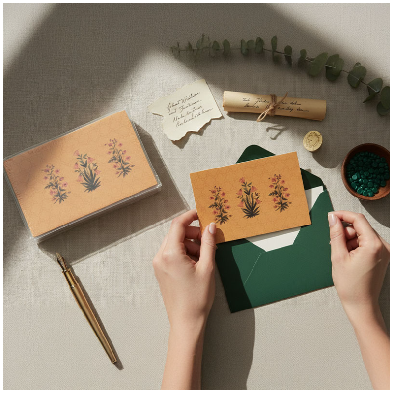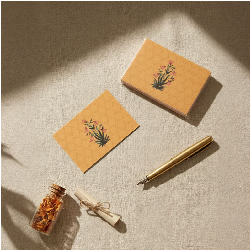 The KCC Gallery Store presents a curated Mughal Collection showcasing the regal beauty of Mughal art, which flourished in India during the 16th-17th century under Akbar, Jahangir, and Shah Jahan. Shaped by Indian craftsmanship and Persian influence, the collection includes stationery, bookmarks, coasters, and gift wraps featuring ornate floral motifs and vibrant colours. Each piece reflects timeless elegance and thoughtful design, perfect for gifting or personal collections. Our Note Cards capture the grace of Mughal gardens through detailed patterns and vibrant colours. Crafted with care and inspired by Persian and Indian artistry, these cards are ideal for heartfelt messages, invitations, or thoughtful notes, elevating the art of writing into a timeless experience.
