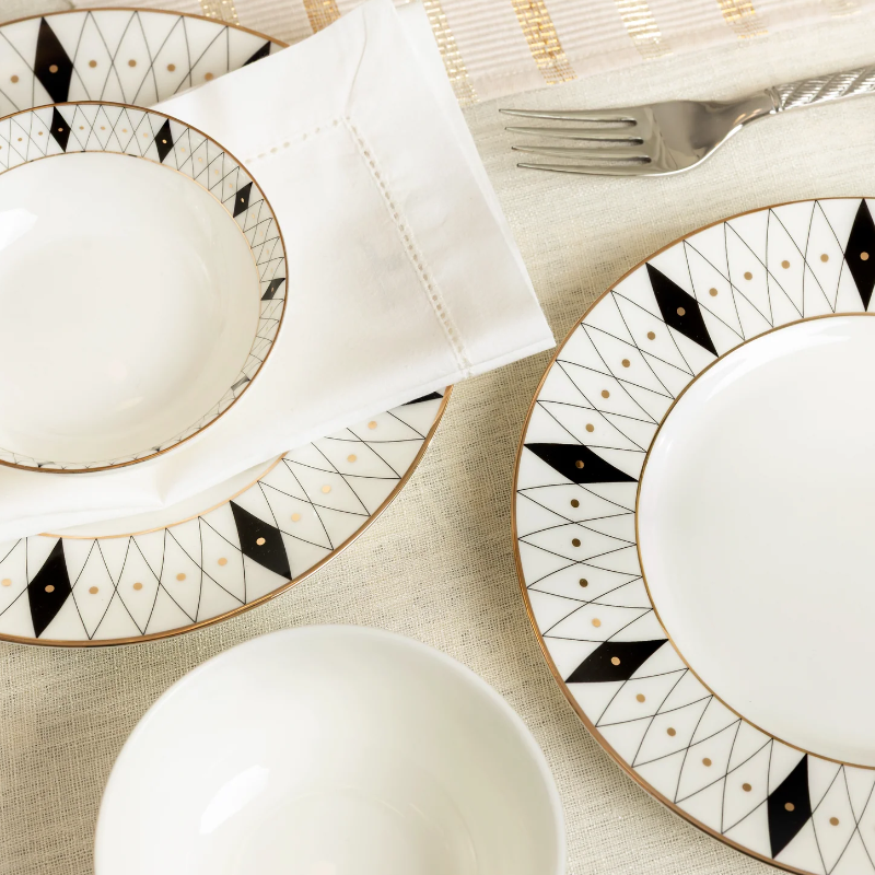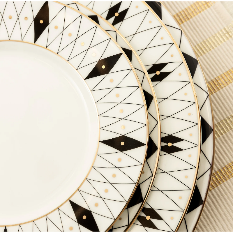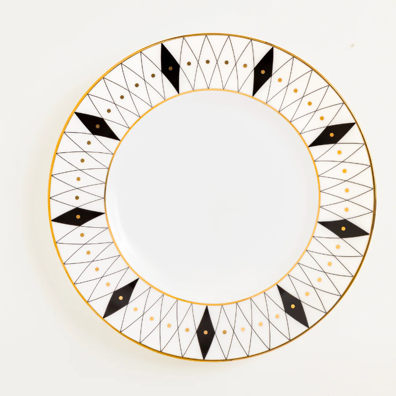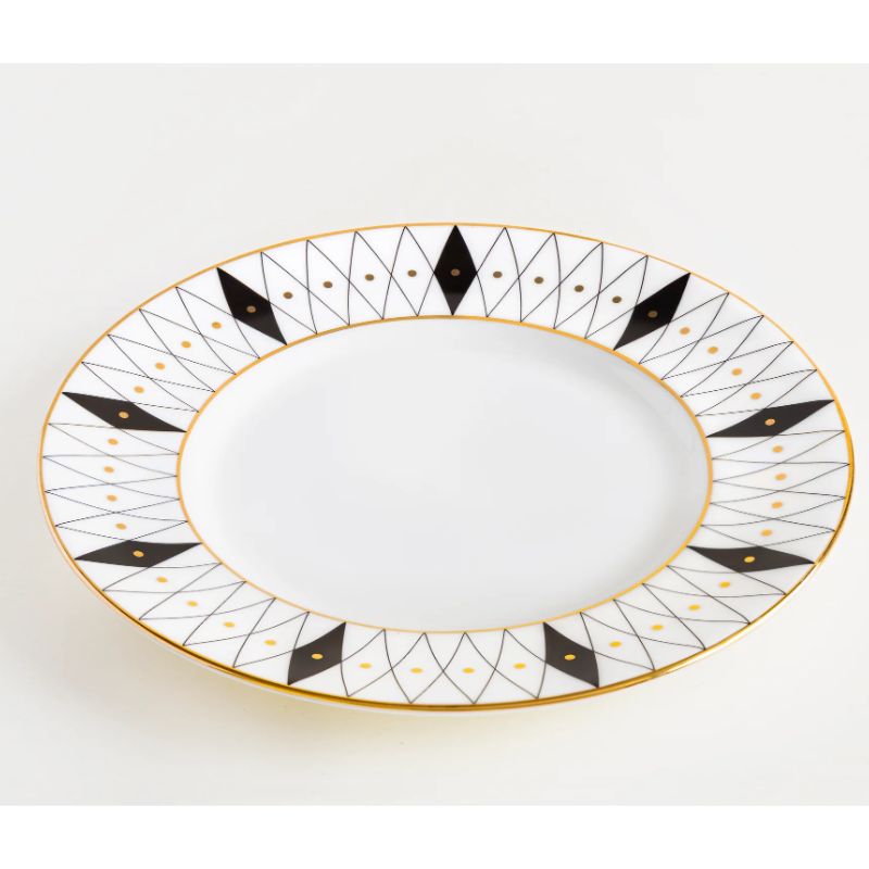 Classic fine china salad plate featuring a bold geometric pattern in striking black and old gold. A timeless classic for formal settings, this piece brings quiet sophistication to your table�perfect for serving fresh salads, refined appetisers, or indulgent desserts. Products are not microwave safe/dishwasher safe. Wash gently with water using a non-abrasive scrub.