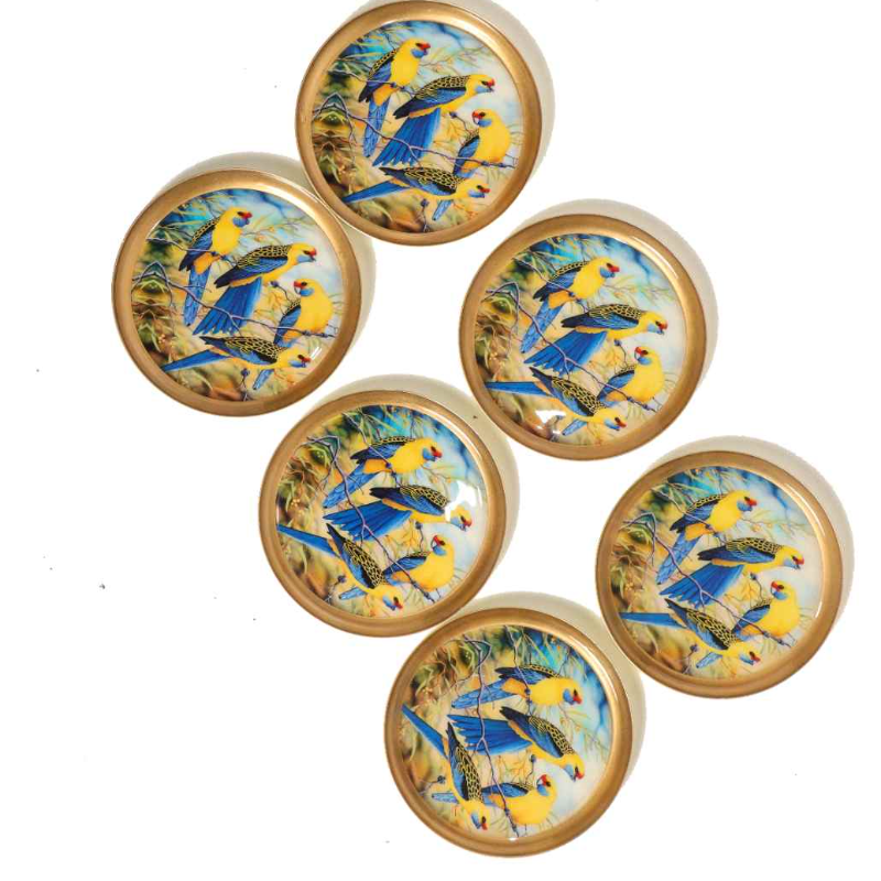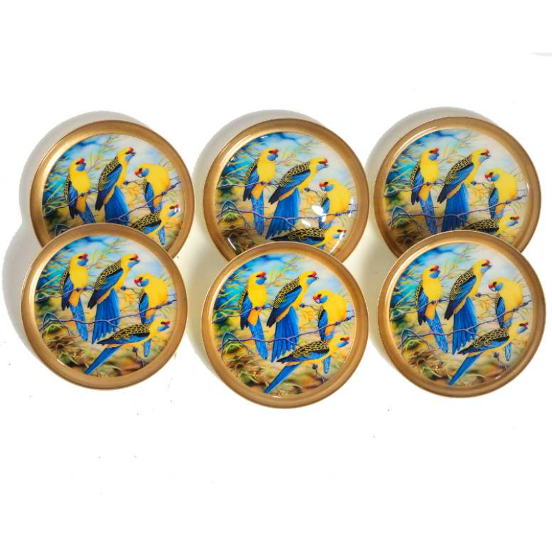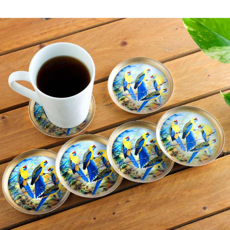These attractive coasters are hand-crafted from metal by skilled artisans. Beautiful blue-yellow parakeet print coasters that makes an elegant statement in your living space. Enjoy your favorite drinks and hot beverages on them, they protect your table and dining surface while giving a beautiful vibrant feel to them. A Non-slip grip ensures that your glass, mug, or cup stays in place and helps prevent spills. Ideal as gifts for any family event, housewarming pooja, or festive occasion. Do not put it in the dishwasher, microwave, freezer, or oven. Wipe with a damp cloth and dry. Occasionally wipe it with mild soapy water and dry it immediately thoroughly. Do not scrub or use any hard chemicals.